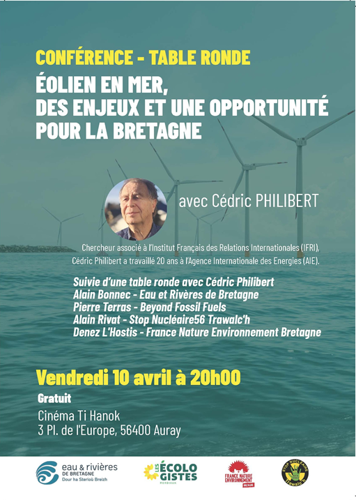 Un collectif d’associations — Beyond Fossil Fuels, Eau et Rivières de Bretagne, France Nature Environnement Bretagne, Stop nucléaire 56 Trawalc’h — et les Écologistes du Morbihan organisent une Conférence-Table ronde sur l’éolien en mer au cinéma Ti Hanok à Auray le vendredi 10 Avril à 20h L’événement s’ouvrira par une intervention de Cédric Philibert, expert…
